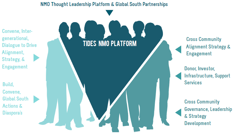 There are innovators who need infrastructure and support to scale their NMO efforts across communities. Our expertise as a progressive infrastructure innovator is best qualified to provide a platform that will ensure their success. They need technical assistance, leadership development, strong and effective networks, access to capital and a nurturing platform for the exchange of transformative ideas born out of lessons learned. We will do this by building, strengthening and leveraging our core business in concert with new Tides NMO offerings in key U.S. and Global South markets. Our core business, fiscal sponsorship, donor advisory, grants management and administrative support services will be leveraged into the Global South and throughout its diasporas by working with key Global South strategic partners. This will position Tides as the premier provider of philanthropic, social impact investing and community development support services to a growing community of donors, investors and doers in the USA and emerging market countries lacking philanthropic infrastructure. The NMO platform will offer research, products, leadership learning and innovation networks, strategy, consulting, coaching, team building services, and social impact investment instruments. These will be available for philanthropists, non profits/NGO’s, corporations/ multinationals, investors, entrepreneurs, governments, institutions, leaders and communities who care about creating social and business impacts for their stakeholder communities.